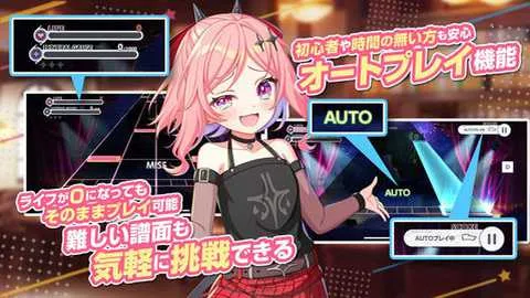 节奏游戏部分提供自动模式,玩家不仅可放置自动打歌,也能用以确认谱面。 此外,游玩途中即使生命值减少至0,游戏也不会中断结束,可毫无压力地挑战高难度谱面。