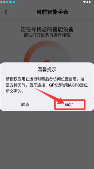 2. 连接便捷:在设备页面点击按钮,即可跳转到手表搜索界面,按提示授权位置访问,系统将自动搜索手表,完成后续的配对连接。